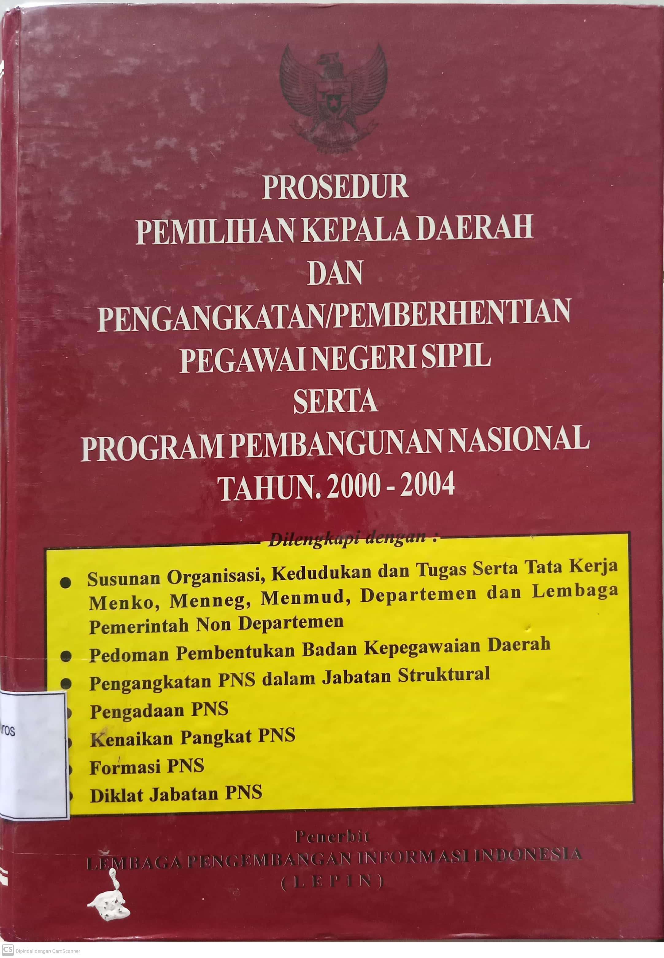 | Judul | Prosedur Pemilihan Kepala Daerah dan Pengangkatan / Pemberhentian Pegawai Negeri Sipil serta Program Pembangunan Nasional tahun 2000-2004 / Iwan Kurniawan |